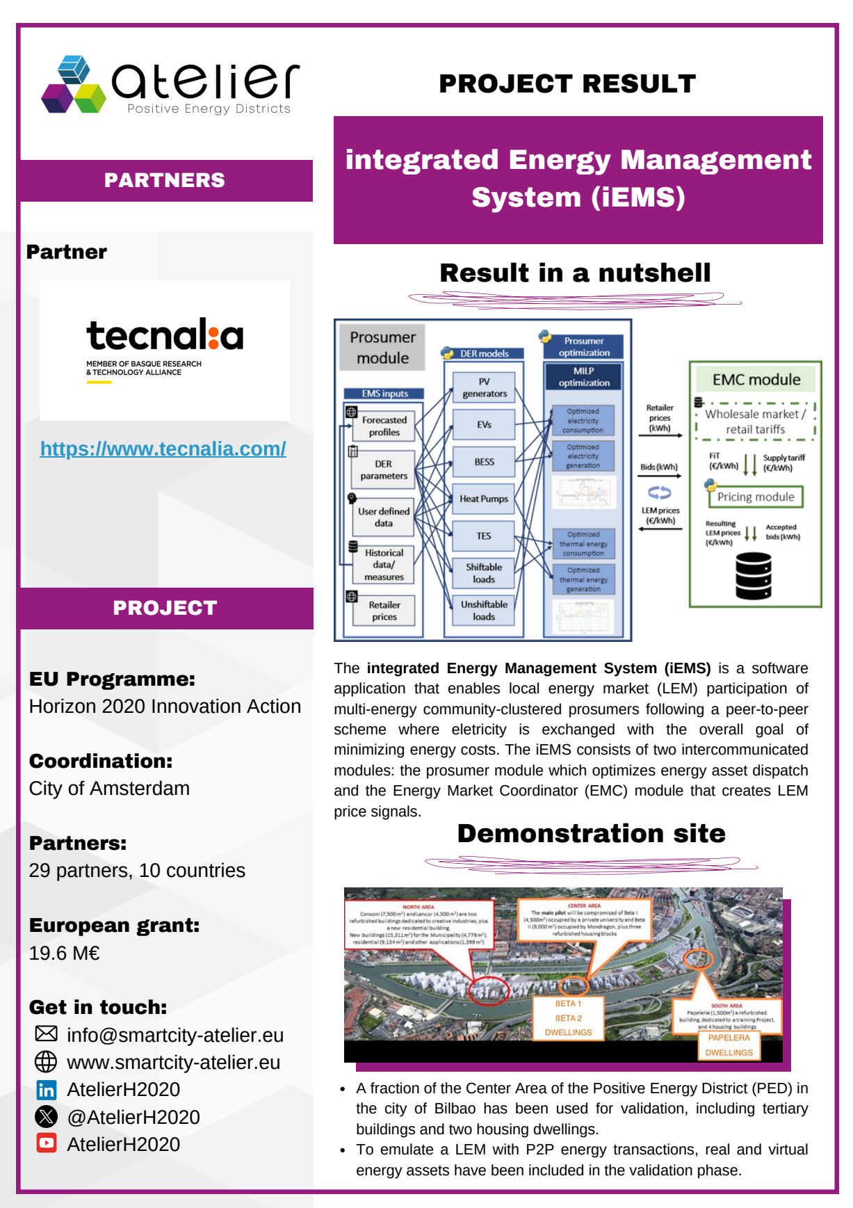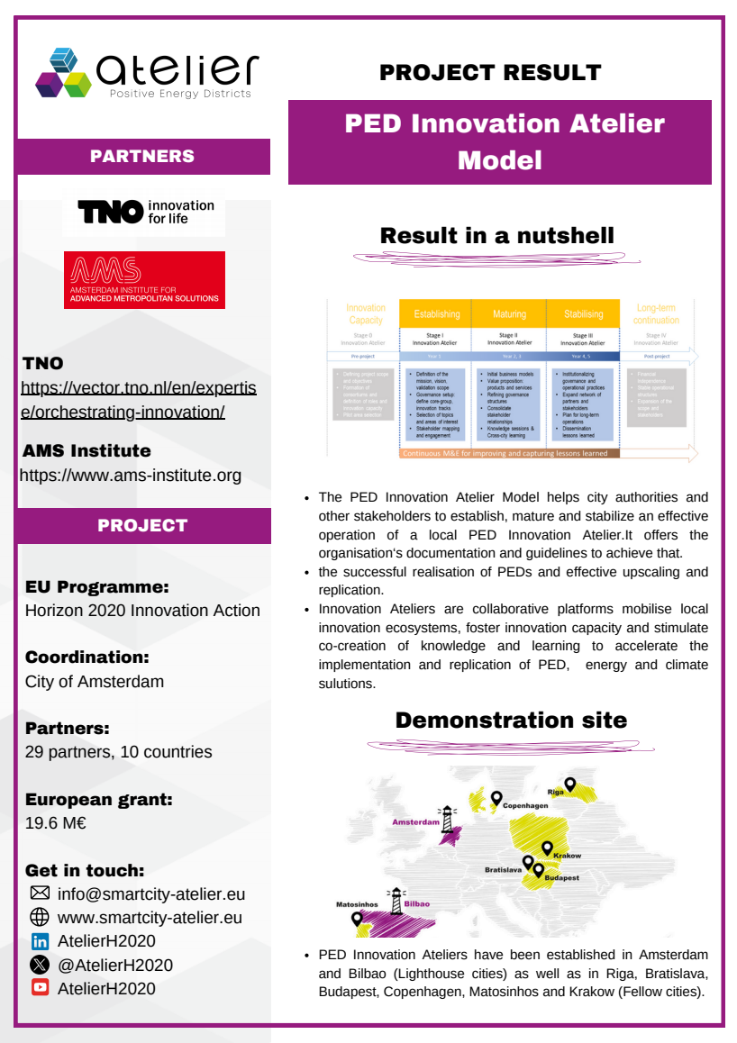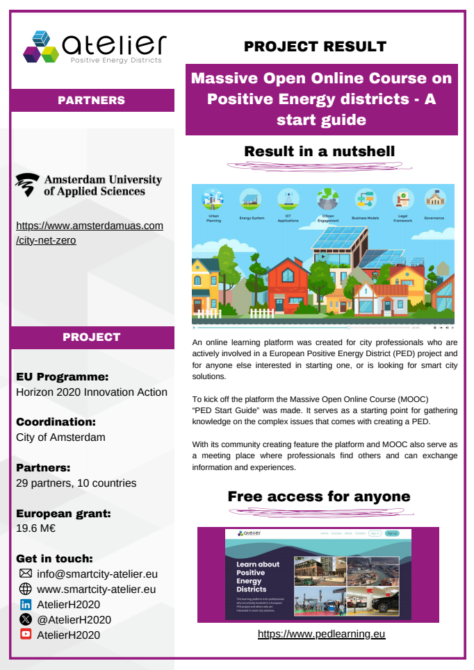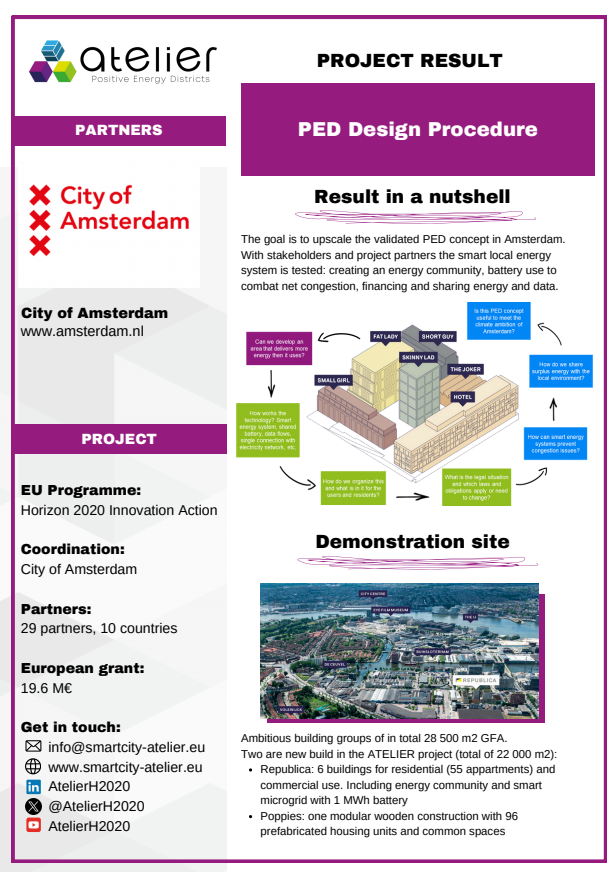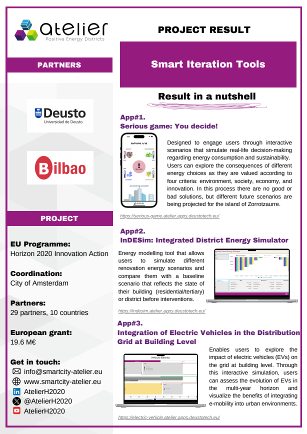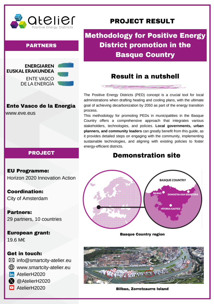 Solution Factsheets PED Design Procedure Massive Open Online Course on Positive Energy districts - A start guide Local Energy Cooperative - Governance Structure Life Cycle Assessment (LCA) tool for Positive Energy Districts (PED) integrated Energy Management System (iEMS) PED Design Procedure Innovation Atelier - PED design consultancy Software in the Loop (SIL) Lab Ground Source Heat Pump (GSHP) Advanced Energy Management System with Integrated Energy Market Services Scientific Knowledge on energy data commons Smart Iteration Tools Innovation Atelier Monitoring & Evaluation Framework and Tool Methodology for Positive Energy District promotion in the Basque Country PED Innovation Atelier Model Cities4Zero v2.0 PED concept replication strategy Model portfolio for energy systems impact assessment at district level
