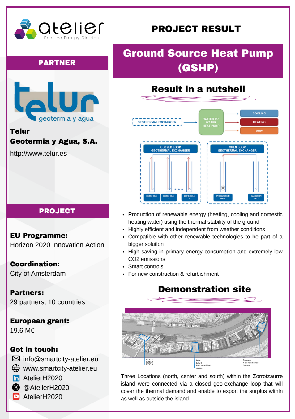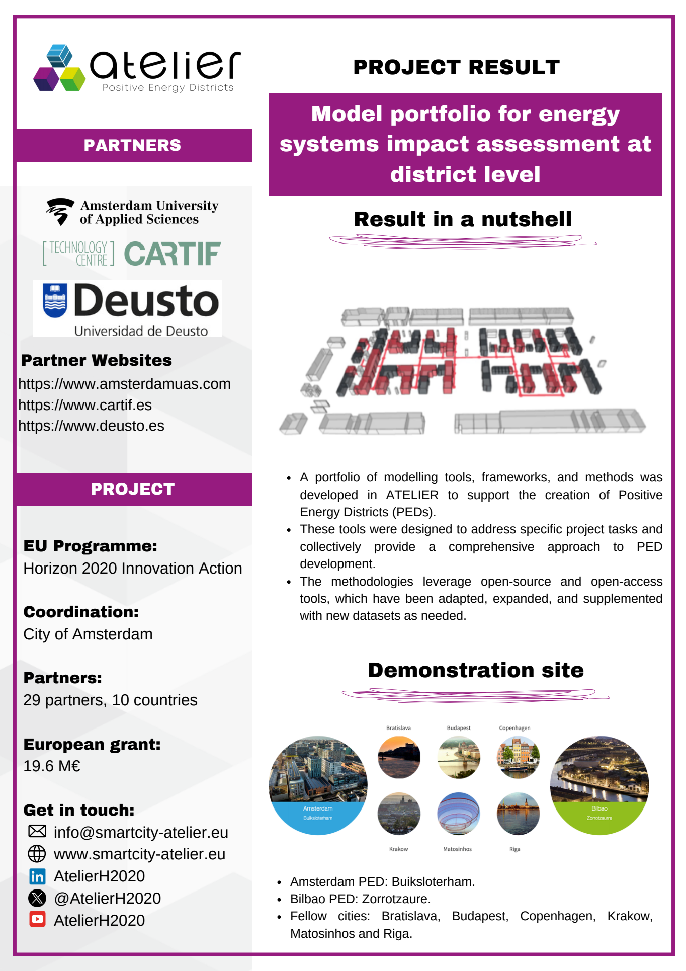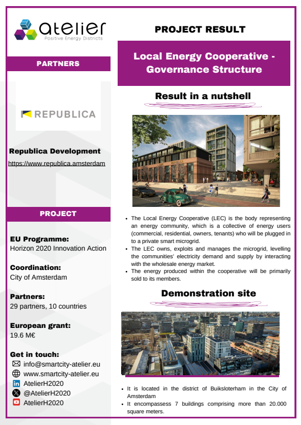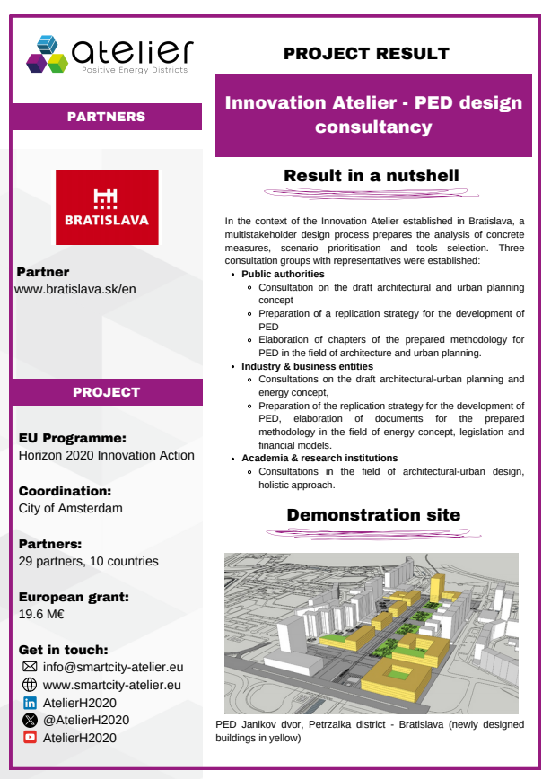 Solution Factsheets PED Design Procedure Massive Open Online Course on Positive Energy districts - A start guide Local Energy Cooperative - Governance Structure Life Cycle Assessment (LCA) tool for Positive Energy Districts (PED) integrated Energy Management System (iEMS) PED Design Procedure Innovation Atelier - PED design consultancy Software in the Loop (SIL) Lab Ground Source Heat Pump (GSHP) Advanced Energy Management System with Integrated Energy Market Services Scientific Knowledge on energy data commons Smart Iteration Tools Innovation Atelier Monitoring & Evaluation Framework and Tool Methodology for Positive Energy District promotion in the Basque Country PED Innovation Atelier Model Cities4Zero v2.0 PED concept replication strategy Model portfolio for energy systems impact assessment at district level